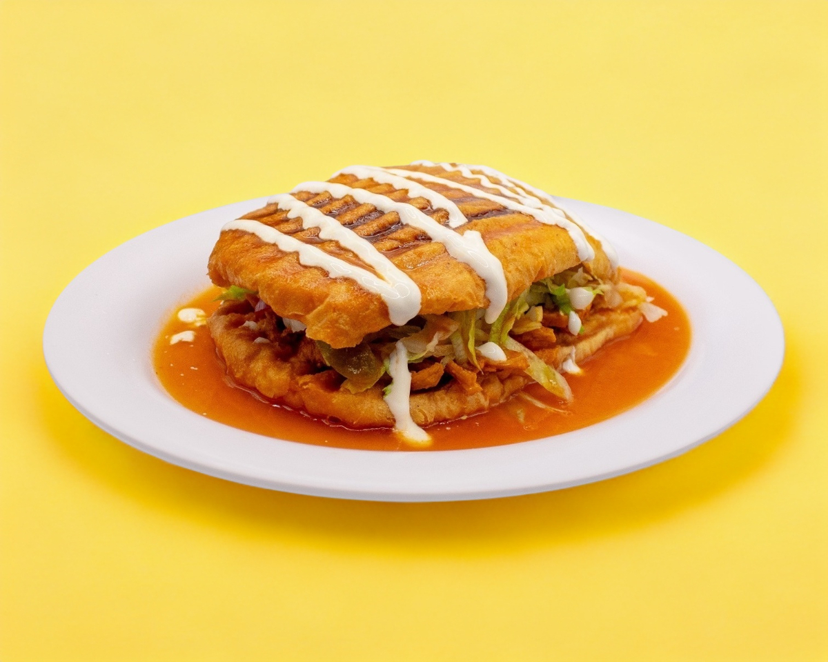 Telera tradicional, por dentro cochinita, lechuga, cebolla curtida, chile jalapeño y mayonesa