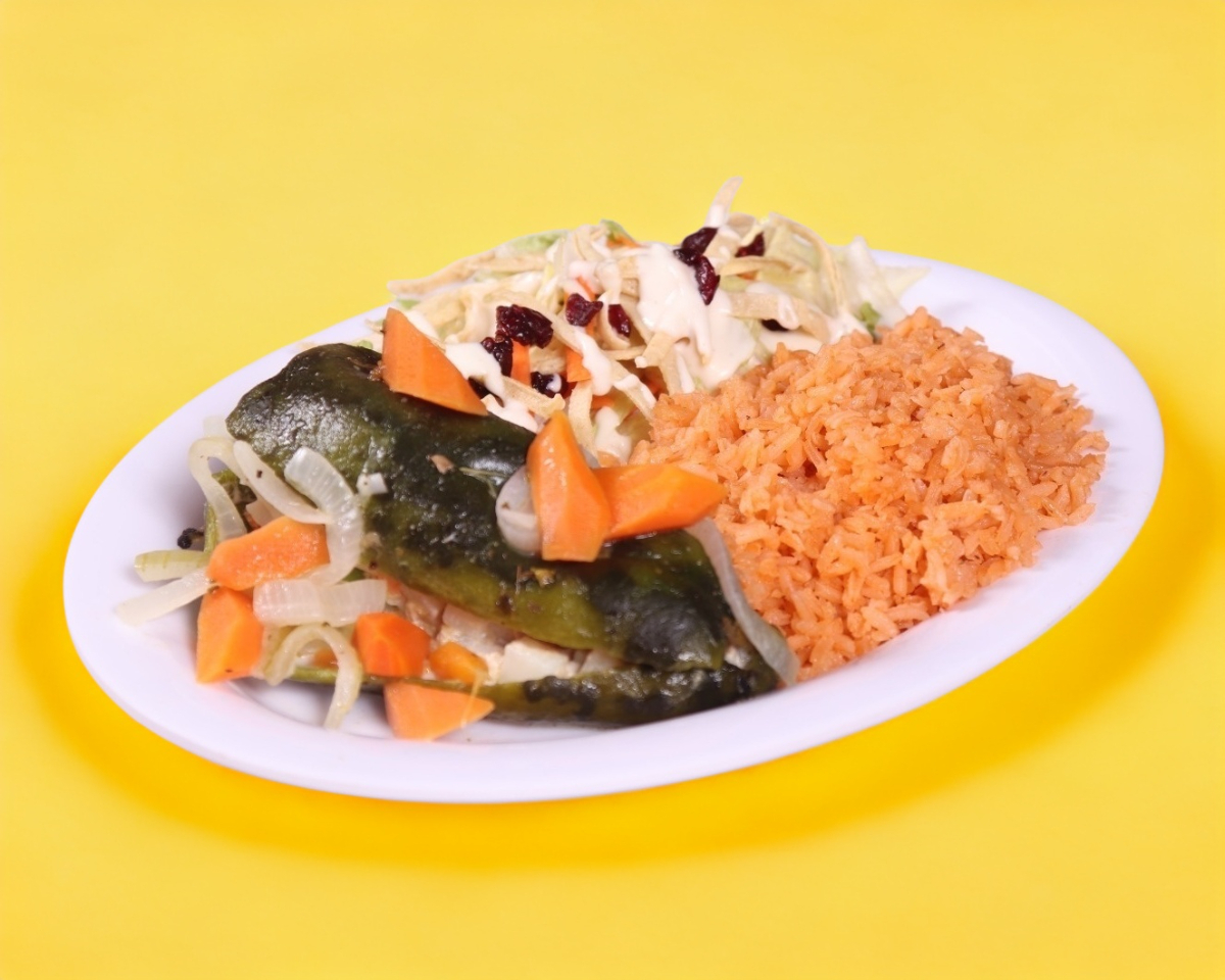 Chile verde capeado relleno de queso, caldo y 2 guarniciones a elegir