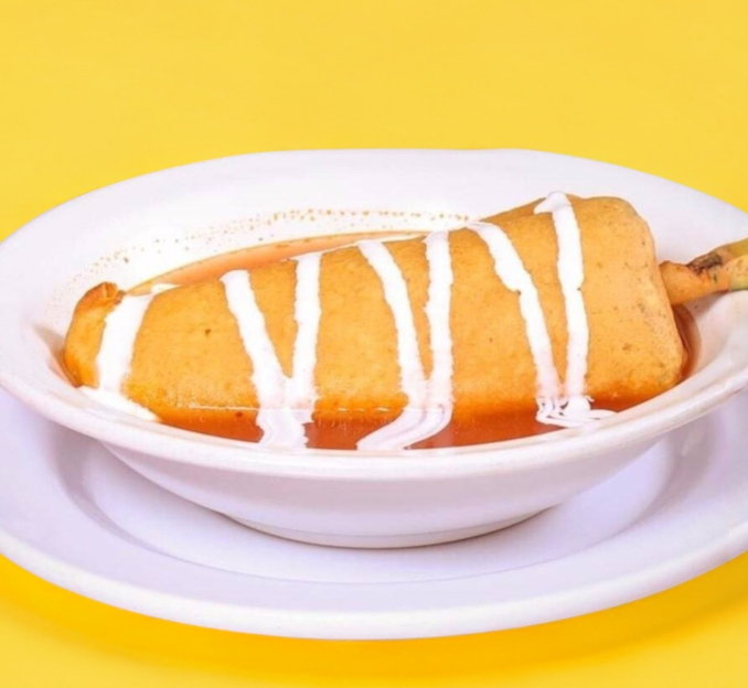 4 Tacos dorados rellenos de papa y res, bañados en crema poblana, grano de elote, aguacate, queso y crema