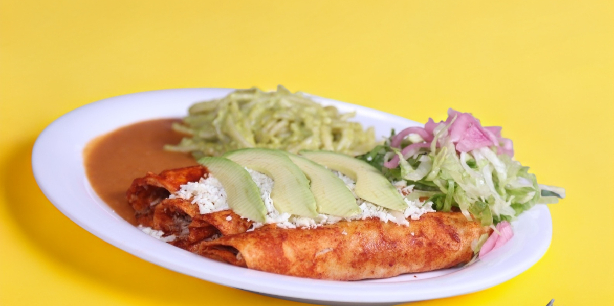 4 Enchiladas de res, lechuga, cebolla curtida, aguacate, queso y crema, acompañadas de consomé para una persona