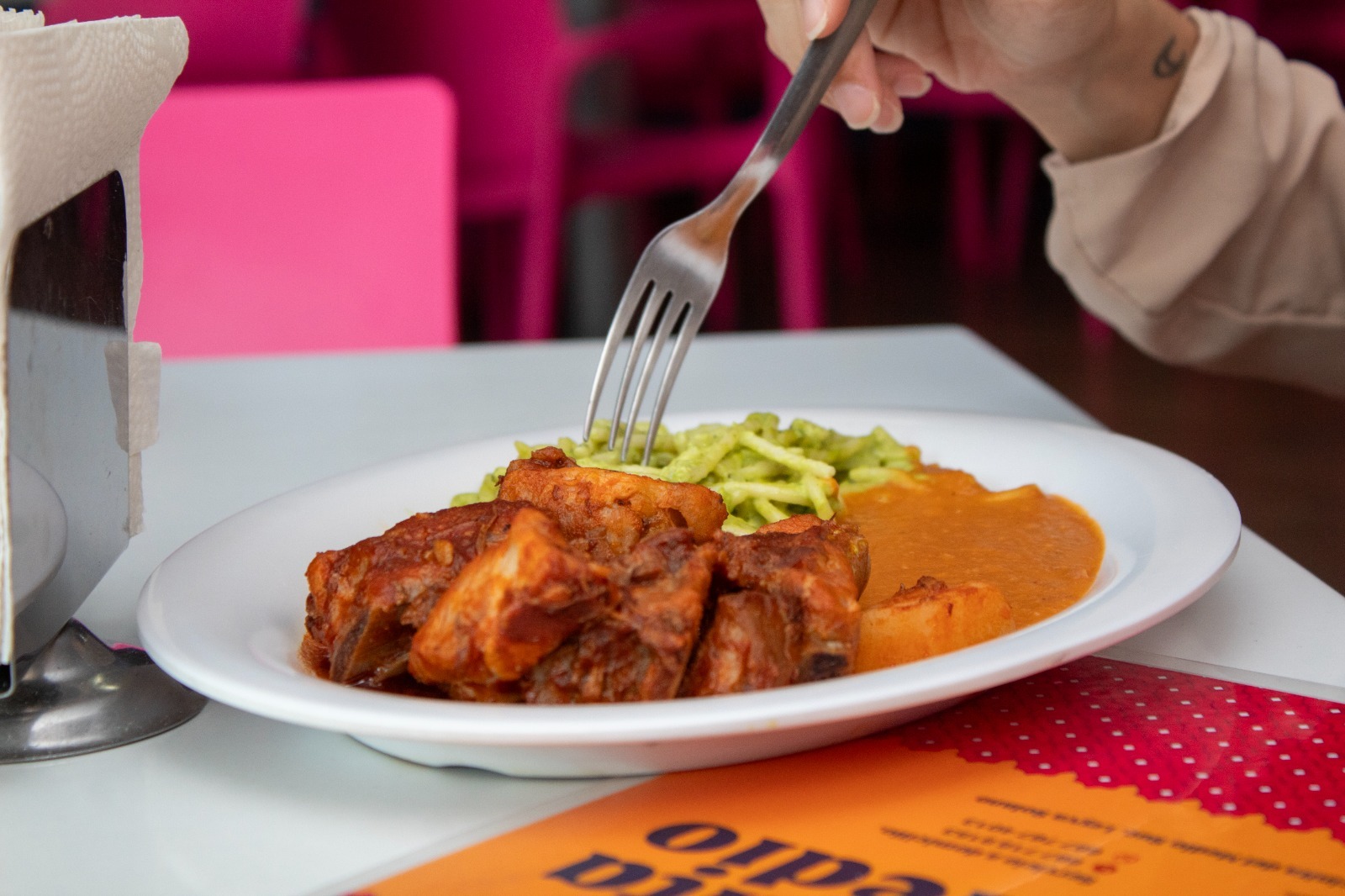Costillitas de puerco bañadas en salsa de chile colorado, acompañada de 2 guarniciones
