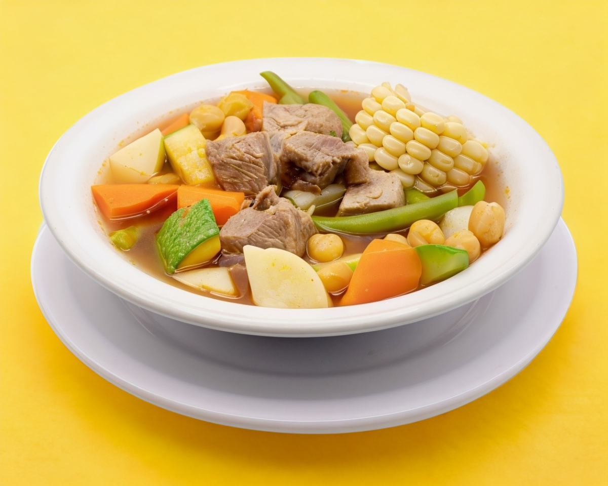 Caldo de res con papa, zanahoria, ejote, calabaza, elote y garbanzo con 2 guarniciones