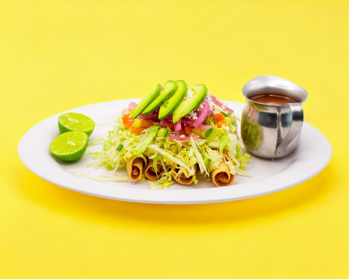 4 Tacos dorados rellenos de papa y res, lechuga, zanahoria, cebolla curtida, aguacate, queso y crema, acompañados de consomé