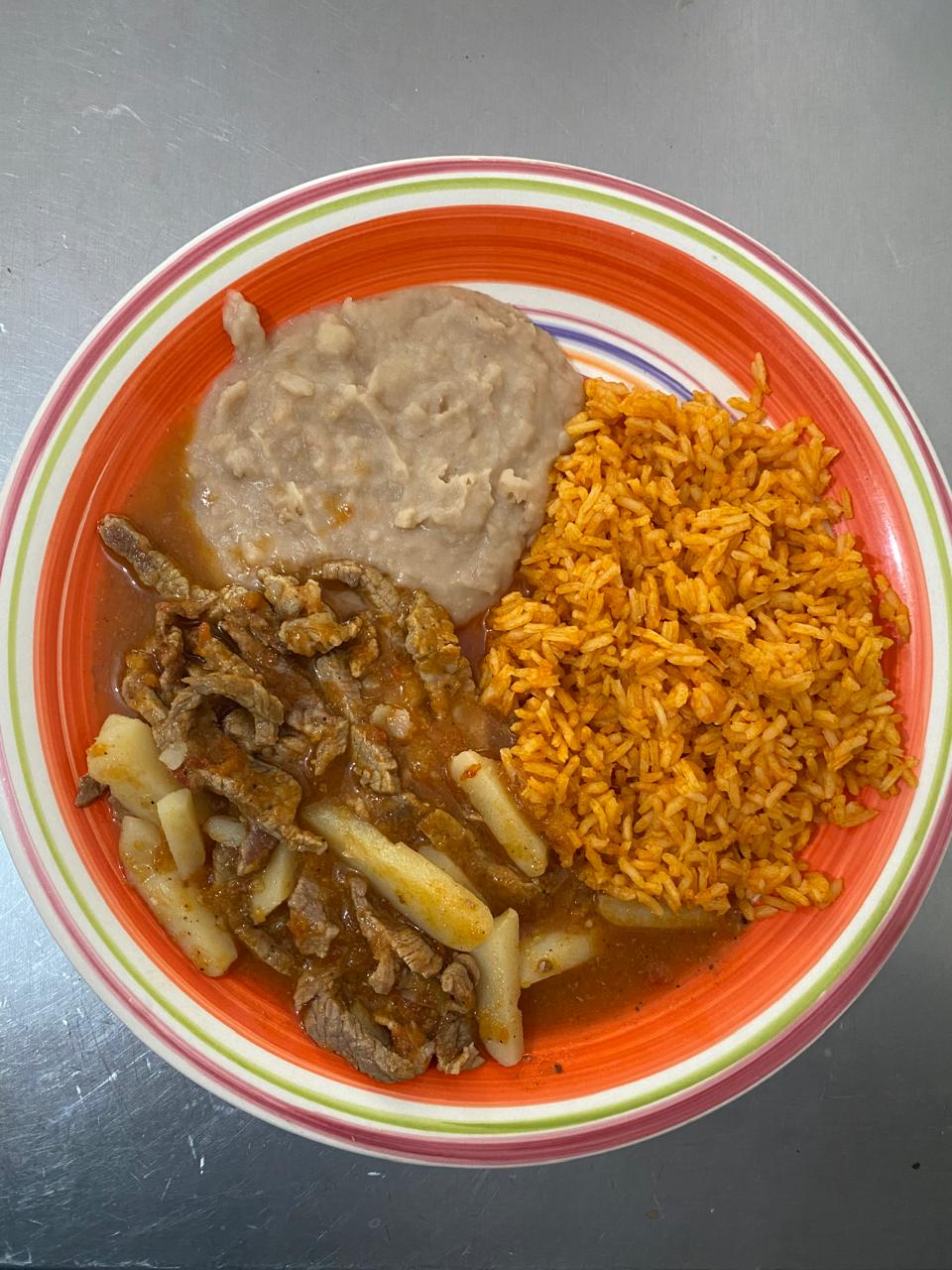 Carne de res guisada con tomate, cebolla, chile, papas y acompañados con frijoles y arroz.