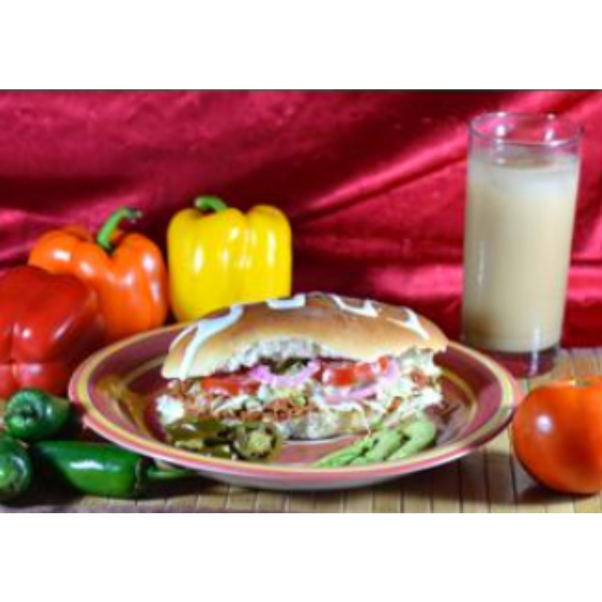 Sándwich relleno de pollo, jamón y queso americano, lechuga, tomate, cebolla, aguacate y chile jalapeño.