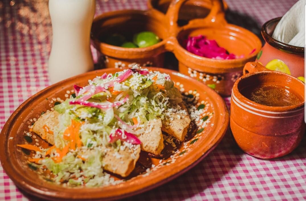 Taco dorado, frijol, carne, papa, lechuga, zanahoria, aguacate, pepino, cebolla y queso.