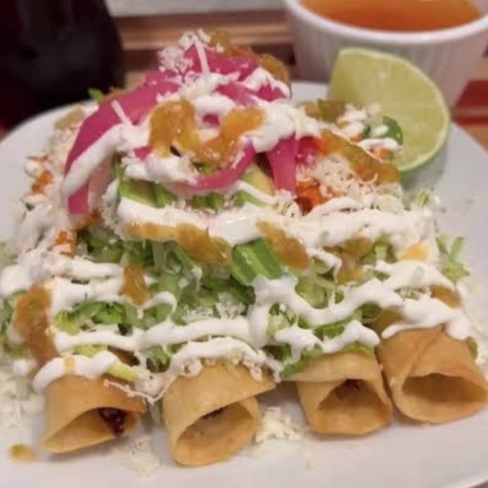 Tortilla de maíz enrollada con carne de res en forma de flauta, con lechuga, zanahoria, pepino rebanado, cebolla morada curtida y queso rallado. Acompañado con consomé de res, salsa de chile de árbol y crema.