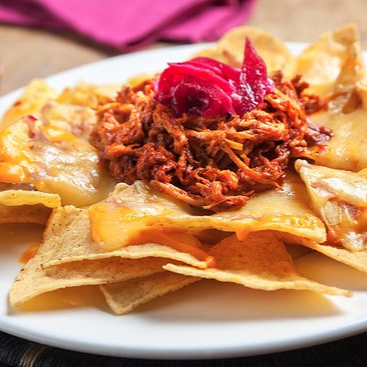 Deliciosos totopos de maíz, bañados en frijoles puercos, aderezo de queso y cochinita pibil. Con un toque de queso rallado y chiles jalapeños.