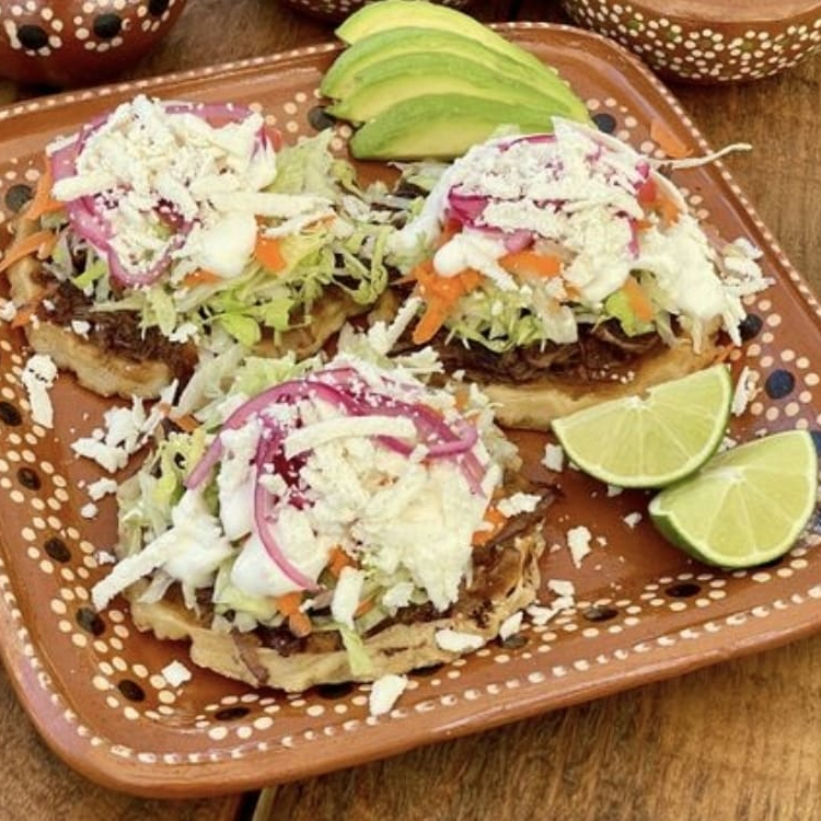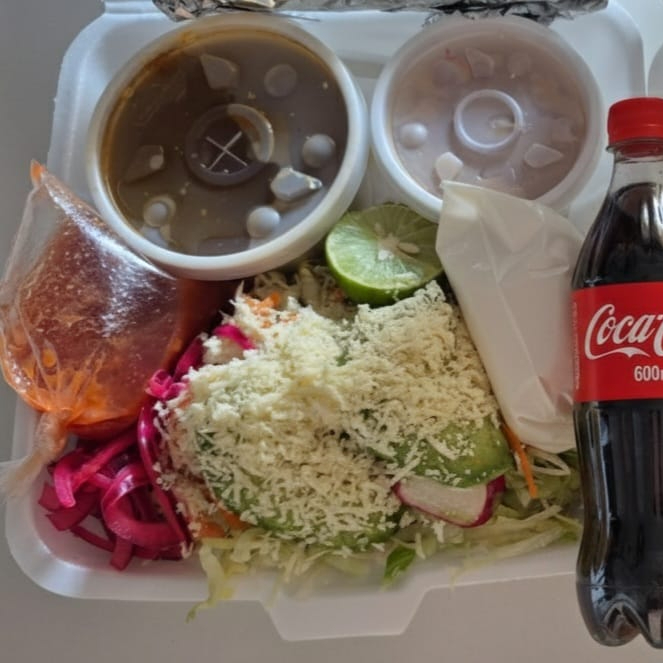 Deliciosas gorditas de maíz con frijoles guisados y carne de res, cubierto de lechuga, zanahoria rallada, rebanadas de pepino y cebolla morada curtida con queso rallado al final. Acompañado con consomé de res, topping salsa de chile de árbol y crema.