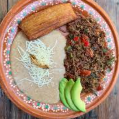 Machaca con Frijolitos, Tamal y Huevo al Gusto