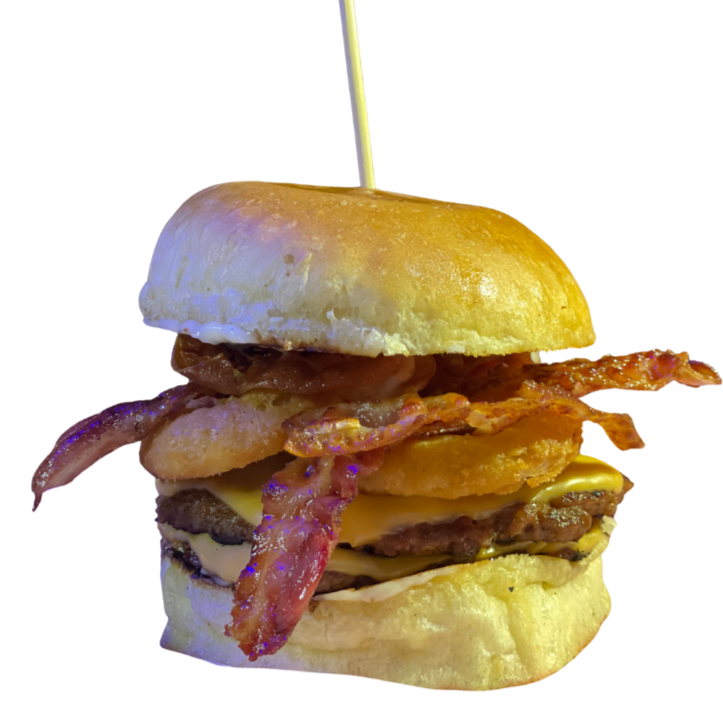 Doble carne, queso americano, tocino y aros de cebolla