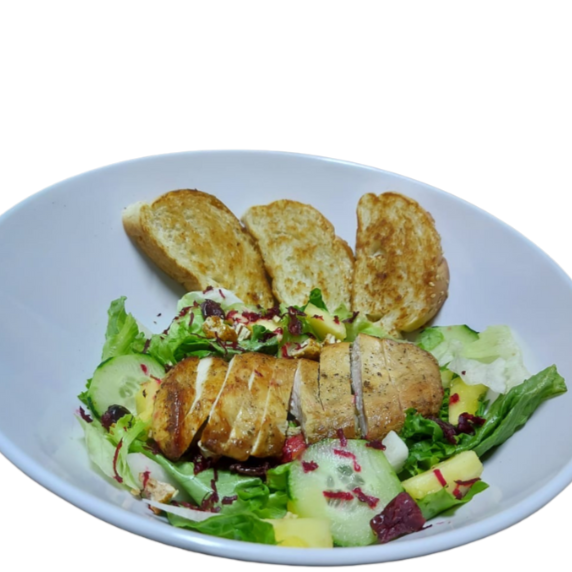Mix de lechugas frescas, betabel, jícama, piña, pepino, arándanos, nueces, (como proteína, pollo a la plancha), bañado en nuestra vinagreta