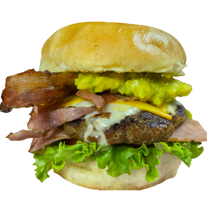Cuacamole, jamón, tocino, queso americano, cebolla caramelizada