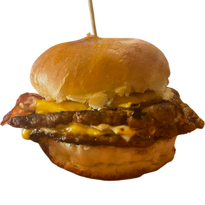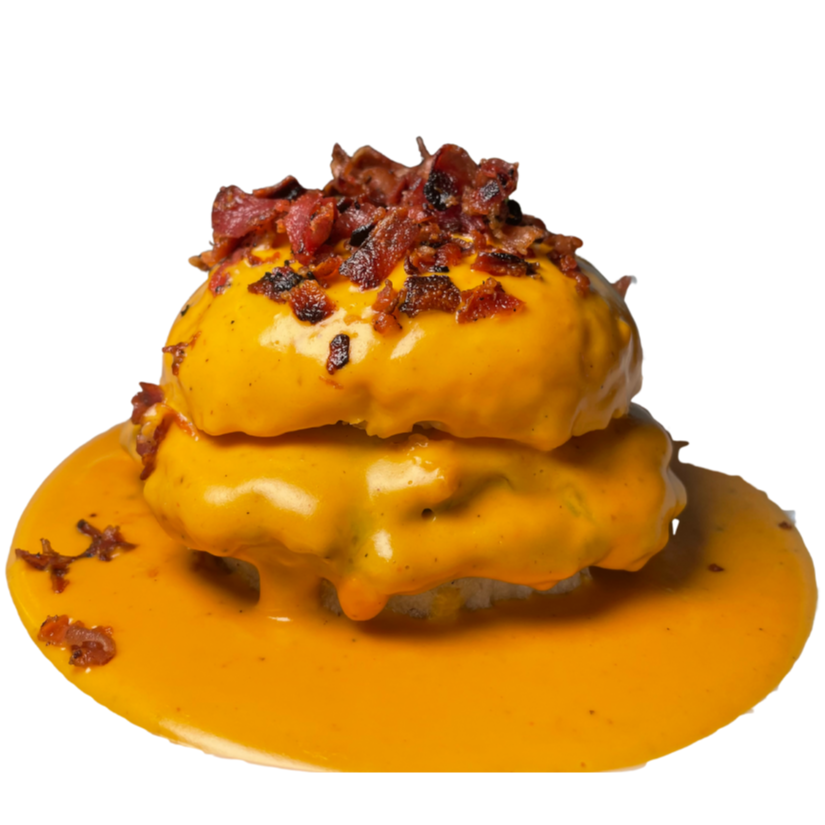 Hamburguesa con doble carne, queso oaxaca, bañada en nuestra salsa de quesos coronada con tocino