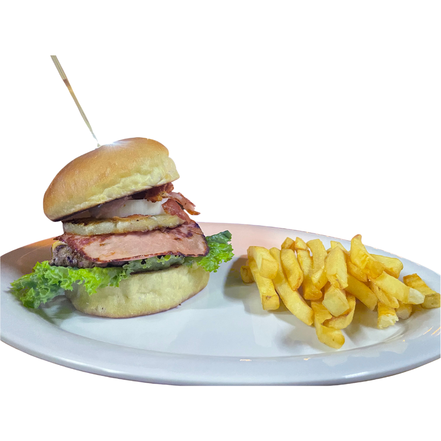 Jamón, tocino, piña, quesp americano, cebolla caramelizada