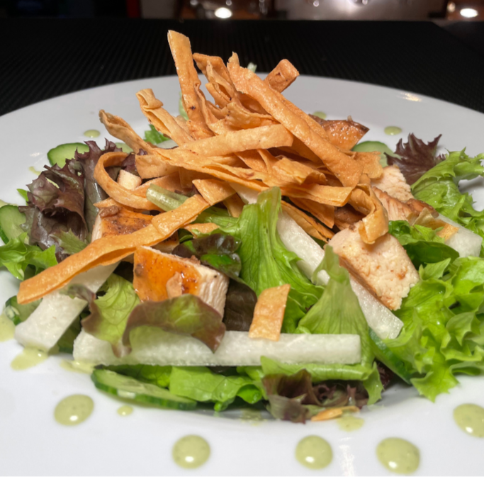 Con un mix de lechugas frescas, pepino, jícama, manzana verde, arandanos, aguacate con frituras de maiz, acompañado de aderezo de cilantro.