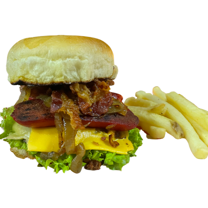 Salchicha asada, tocino, queso americano, jamón, cebolla caramelizada