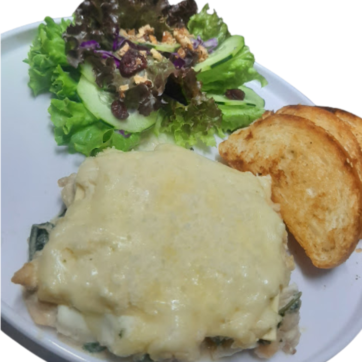 Lasagna con pollo cubierto en salsa Alfredo.