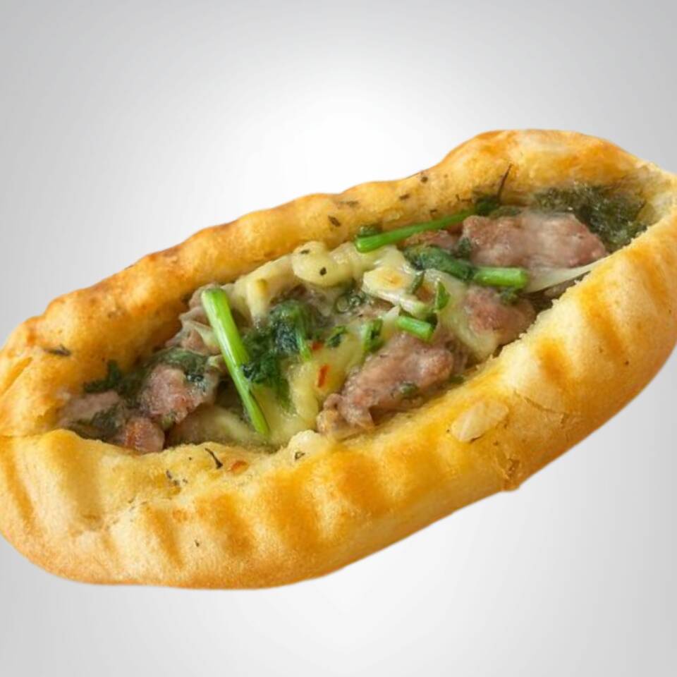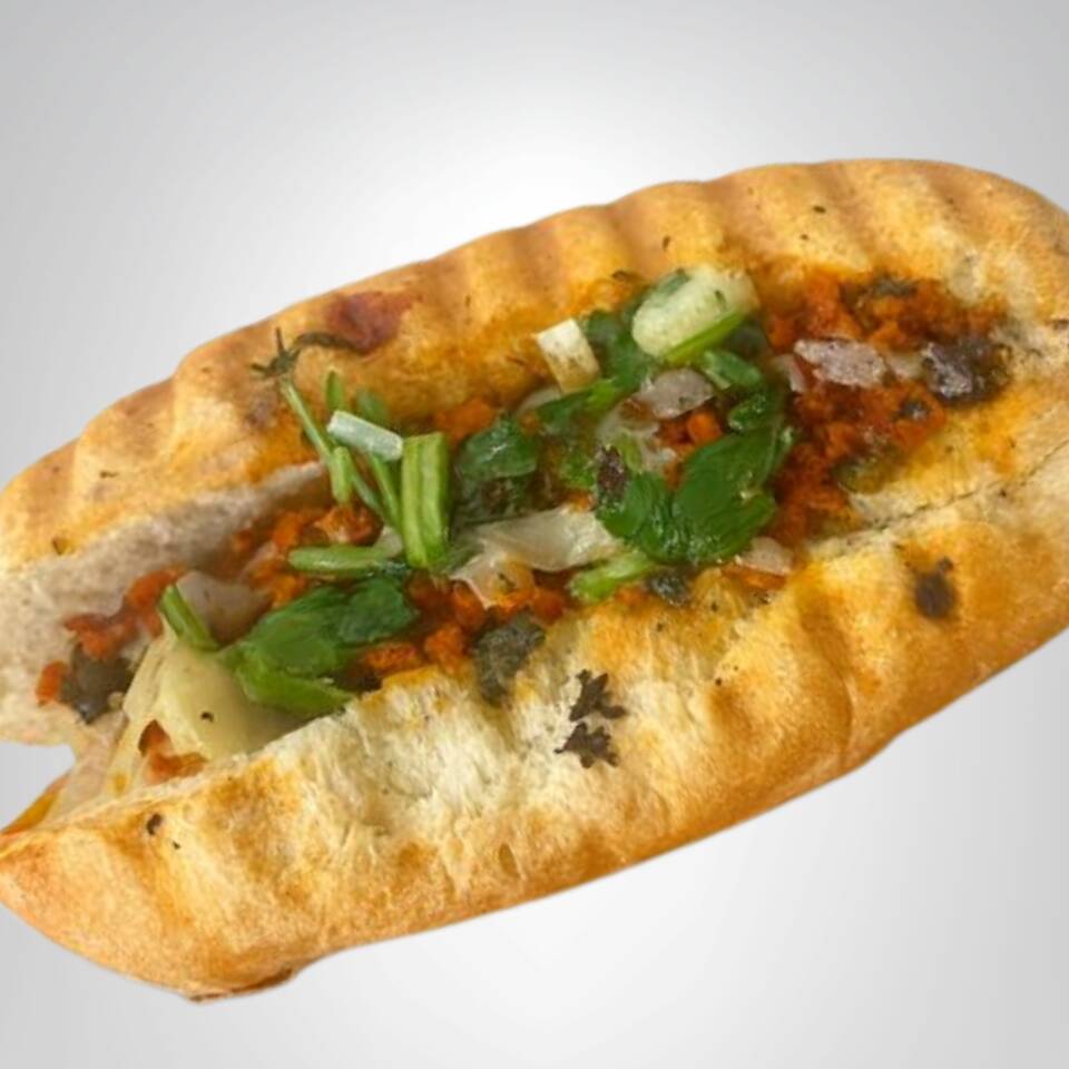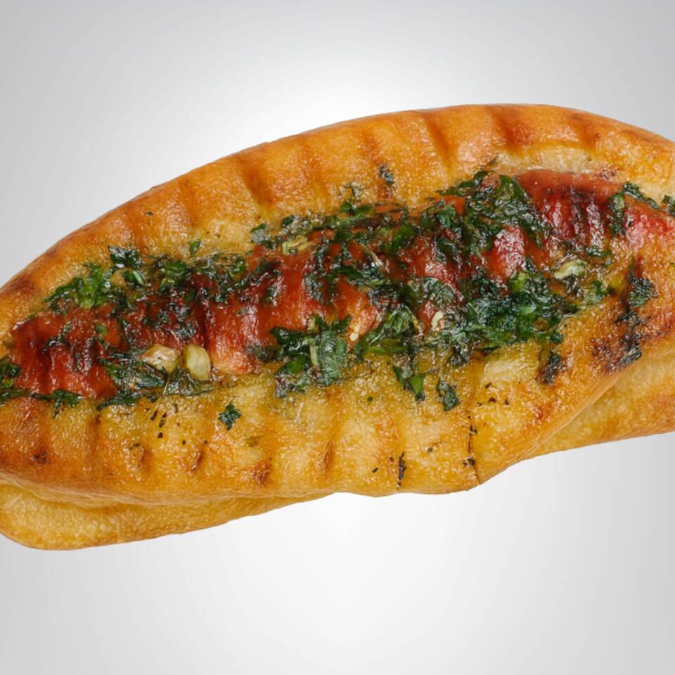 Pan tipo choripán relleno de jamón y queso 🧀, bañado en chimichurri 🧄🌿 y dorado a la plancha para un sabor suave, sabroso y bien doradito 🔥.