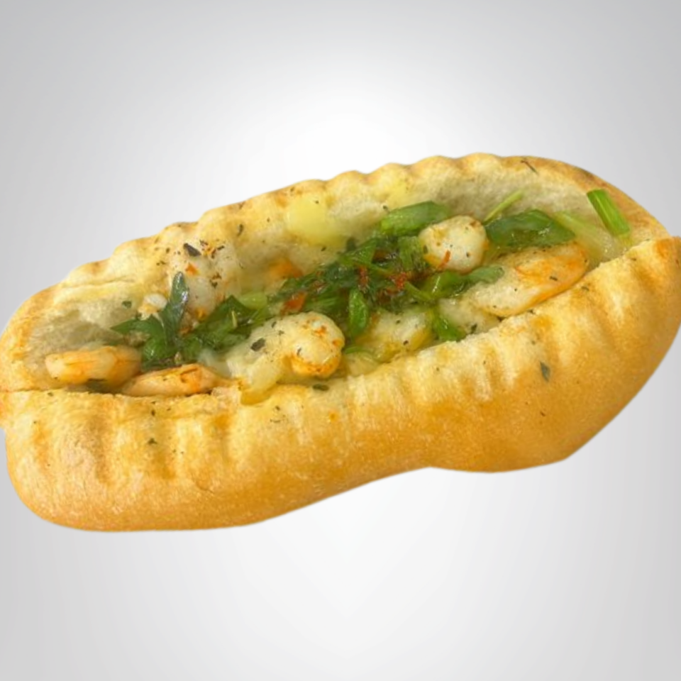Pan tipo choripán relleno de camarones con queso 🧀, bañado en chimichurri 🧄🌿 y dorado a la plancha para un toque marino estilo culichi 😋🔥.