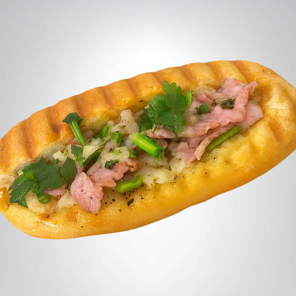 Pan tipo choripán relleno de tocino crujiente con queso 🧀, bañado en chimichurri 🧄🌿 y dorado a la plancha para un sabor intenso y adictivo 🔥🥓.