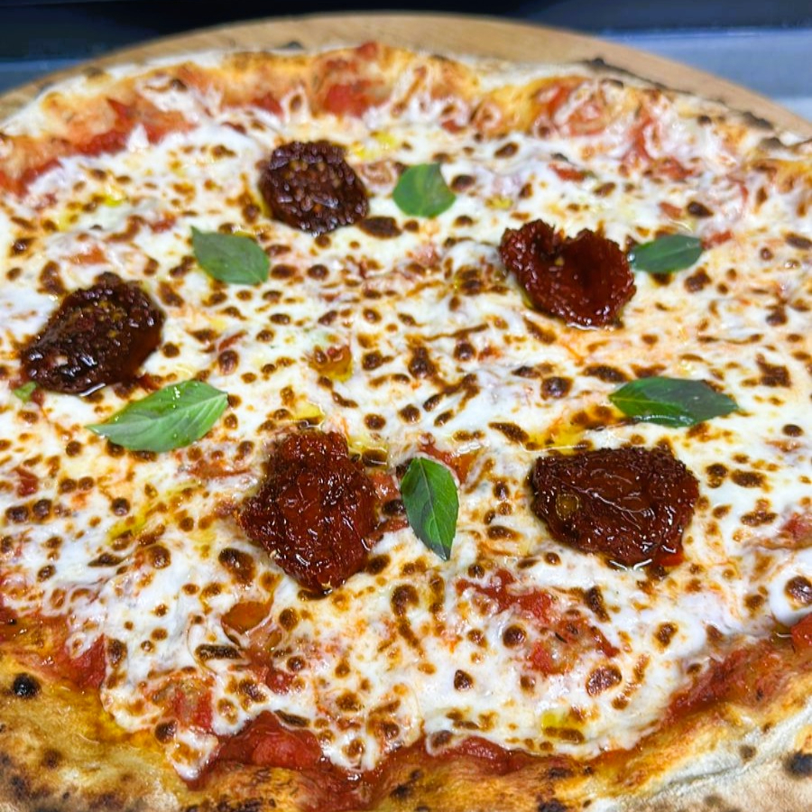 Pizza grande estilo napolitana. Hecha con salsa de tomate de la casa, mozzarella, albahaca y oliva.