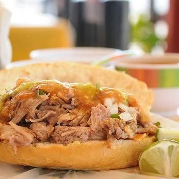 Pan telera relleno de cochinita pibil, cerdo marinado en achiote y especias, acompañado de cebolla morada encurtida y salsas al gusto.