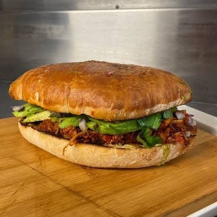 Telera relleno de cochinita pibill,cebolla morada encurtida, aguacate y salsas al gusto.
