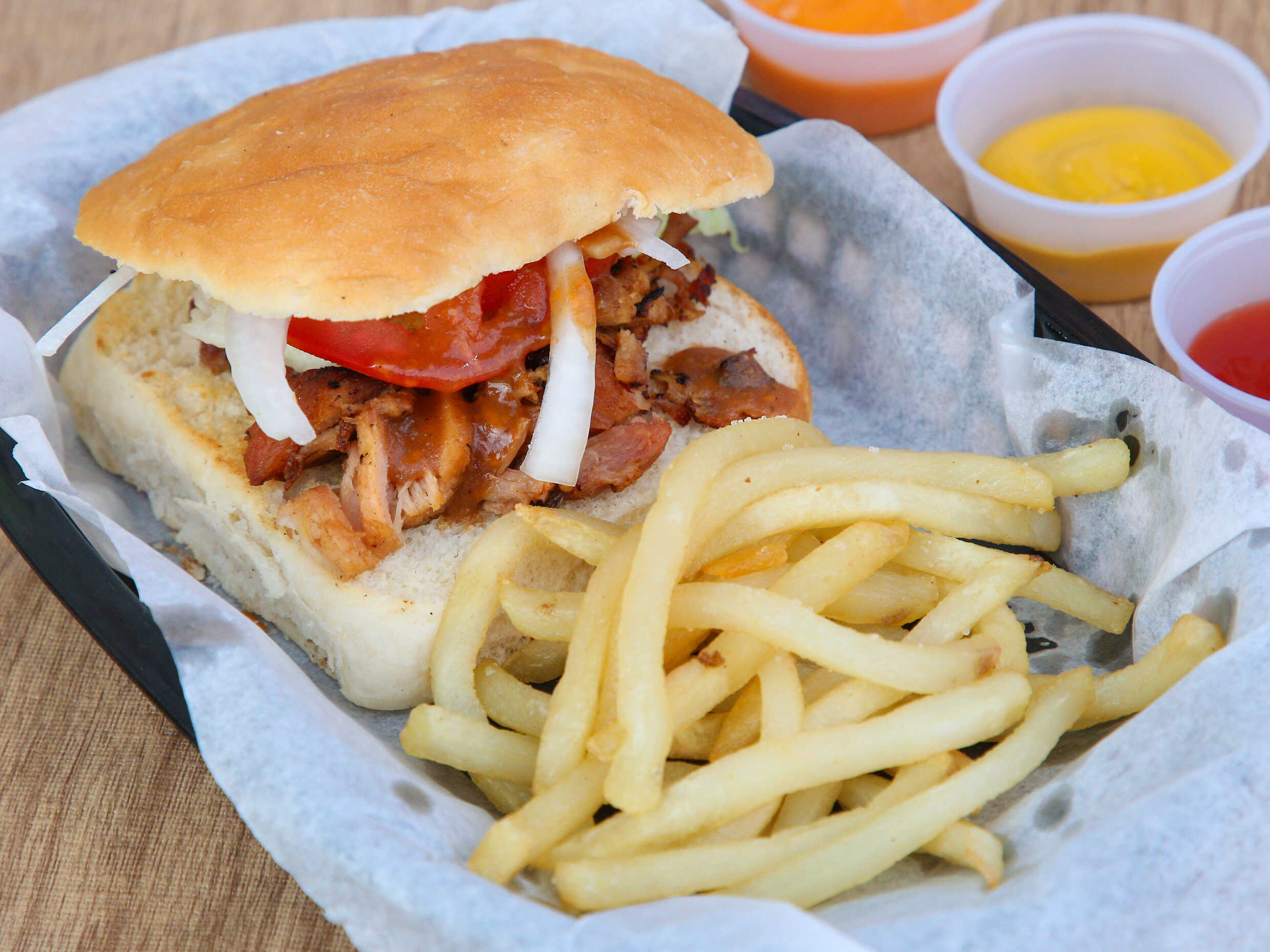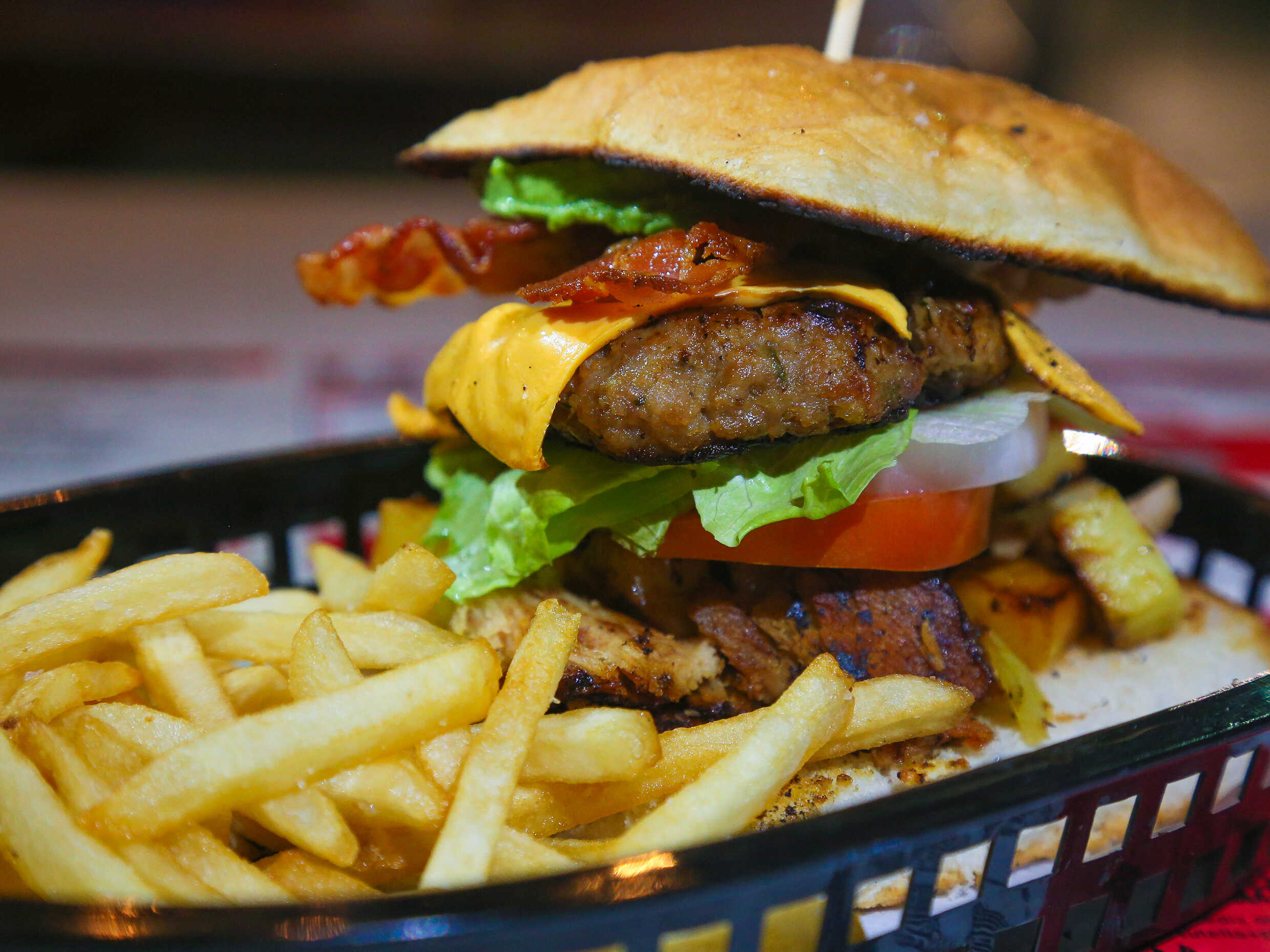 Hamburguesa con nuestra carne casera, costilla bbq, piña, tocino y aguacate, hecha con pan casero y acompañada con papas a la francesa