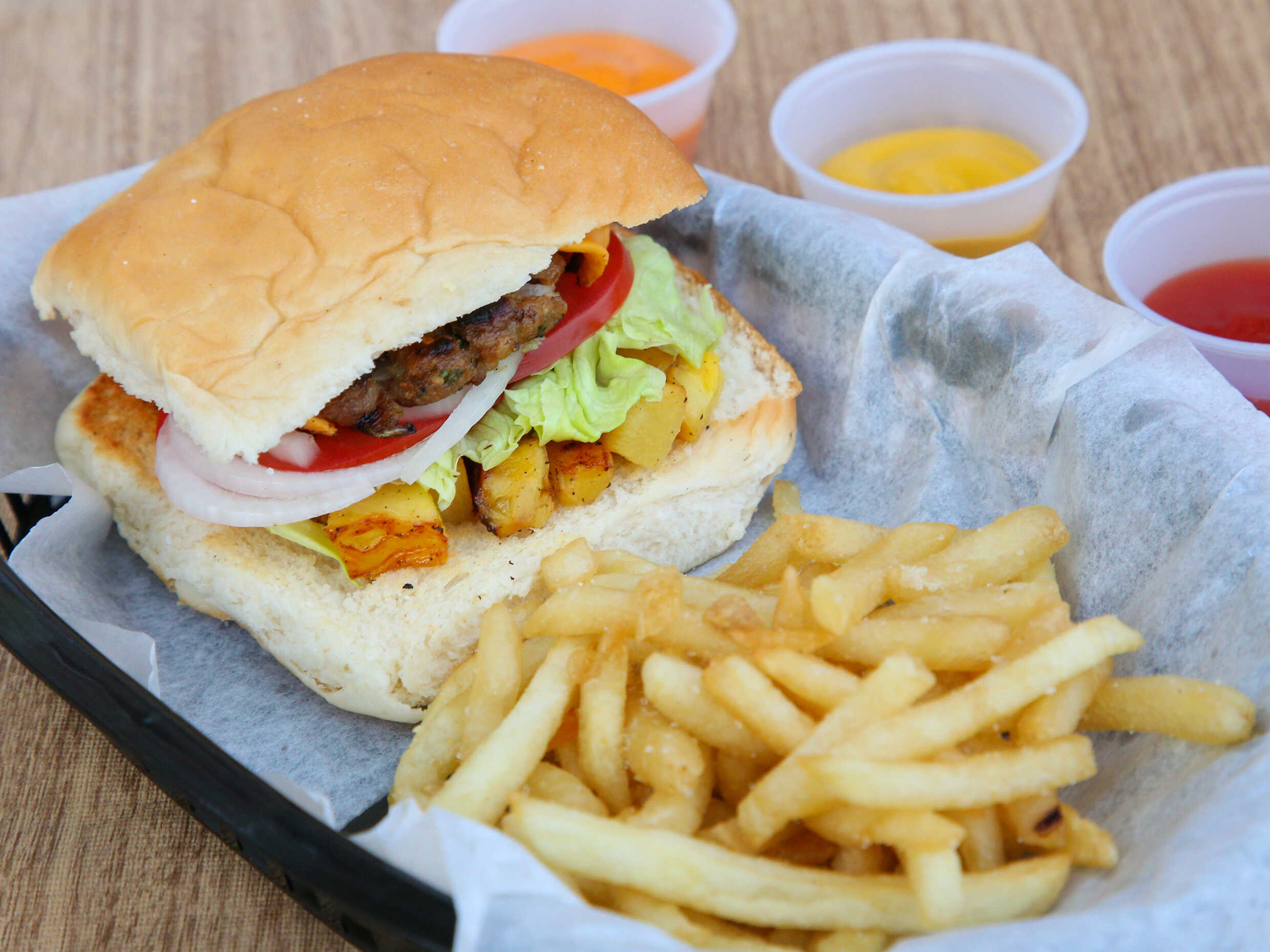 Hamburguesa con carne, trozos de piña caramelizada, lechuga, tomate y cebolla en nuestro pan casero, acompañada de papas a la francesa.