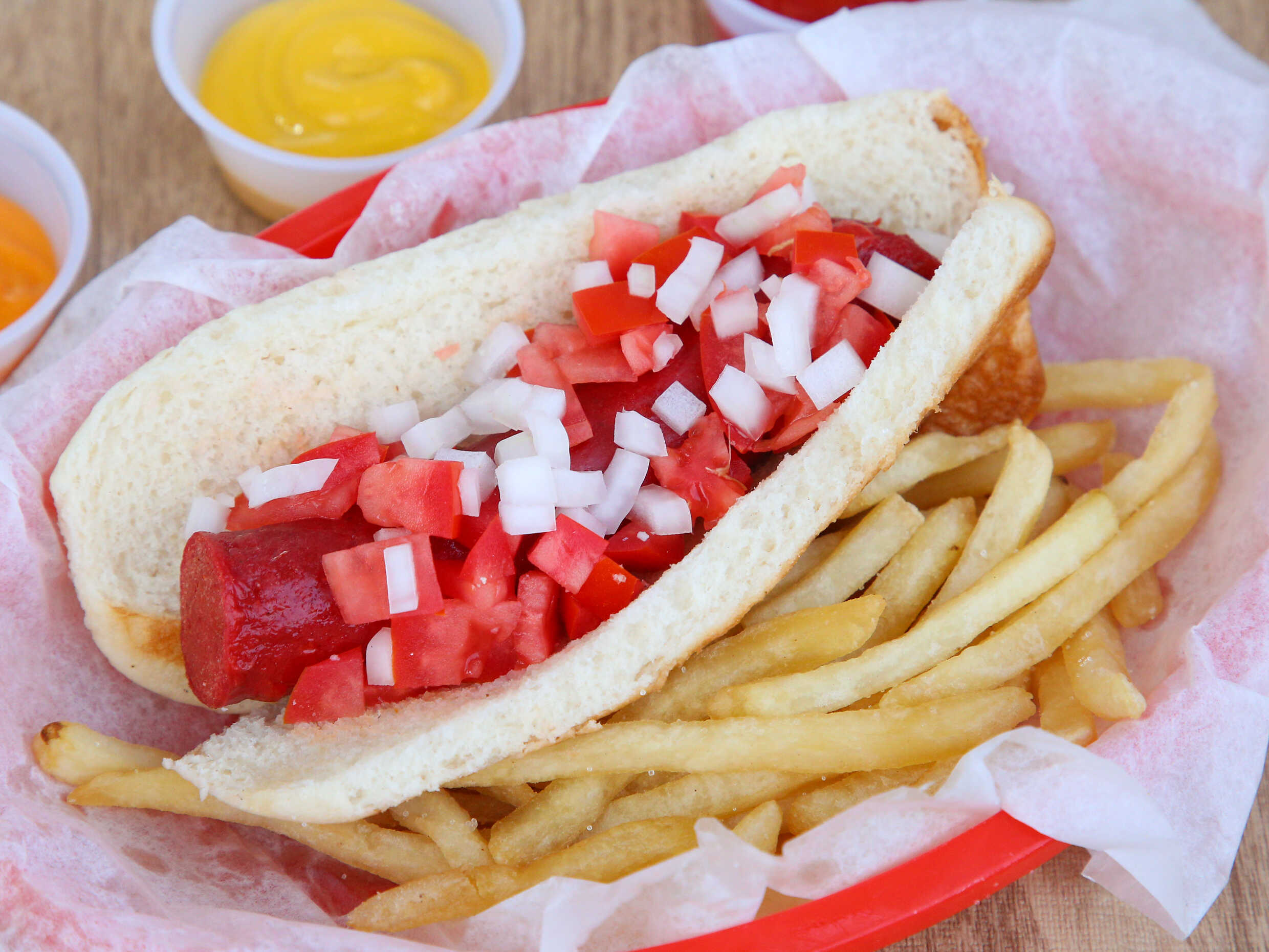 Hotdog con salchicha artesanal, tomate, cebolla en nuestro pan casero, acompañado de papas a la francesa.