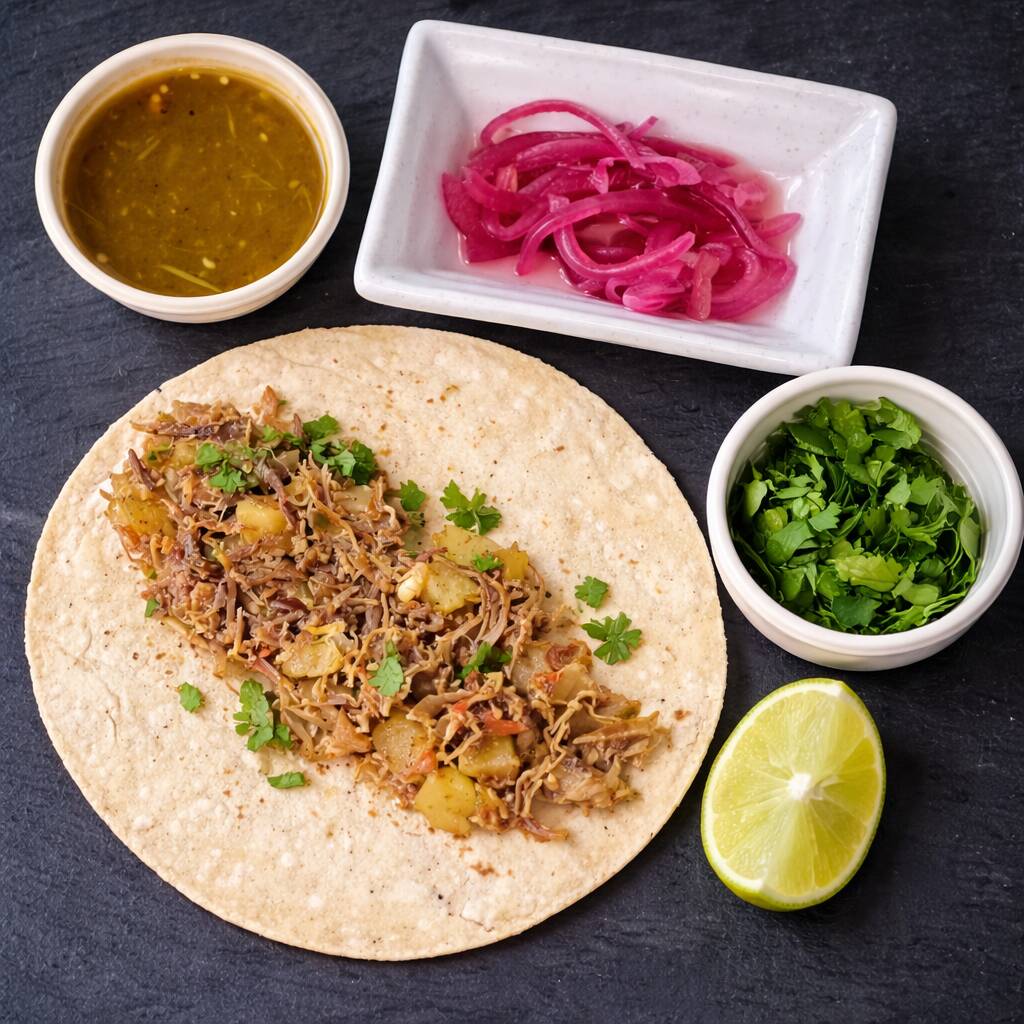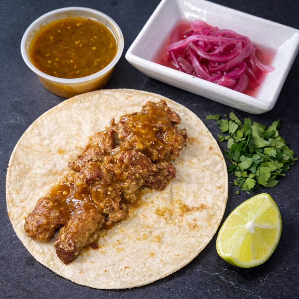 Taco de guiso de cochinita estilo tradicional, servido en tortilla de maíz calientita, casero y delicioso.