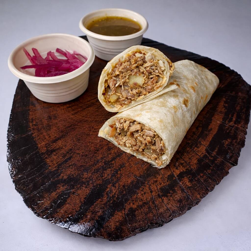 Tortilla de harina calientita con machaca guisada con tomate, cebolla, papa y chile serrano, estilo casero y con sabor tradicional.