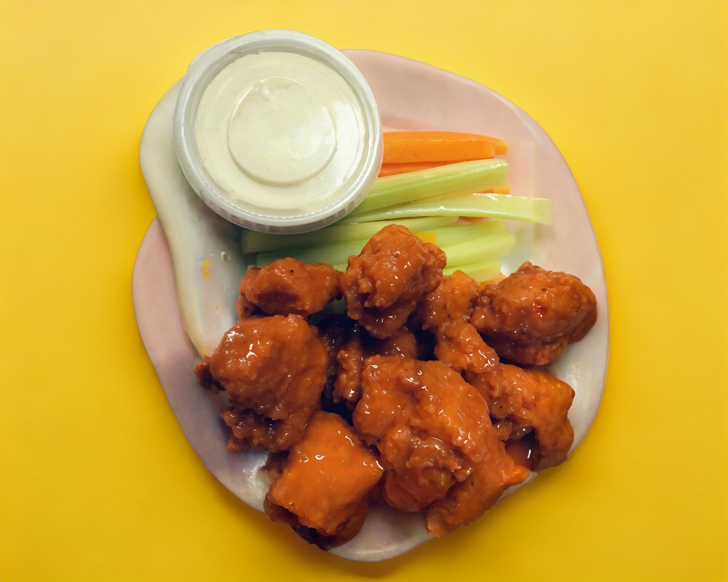 10 pzas. de bolitas de deliciosa pechuga empanizados, bañados en 1 salsa a elegir acompañado de apio, zanahorias y riquísimo ranch de la casa.