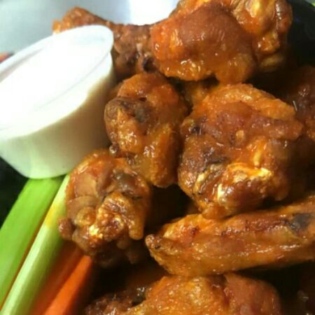 10 pzas. de alitas bañadas en 1 salsa a elegir acompañadas de apio, zanahorias y aderezo ranch hecho en casa.