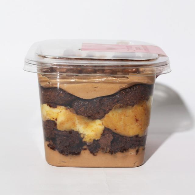 Base de brownie y cheesecake, cremoso betun de queso y chocolates de arroz inflado crunch.