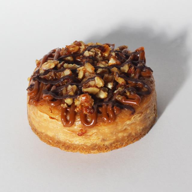 Mini postre con base de galleta, queso horneado decorado con trozos de nuez y cajeta.