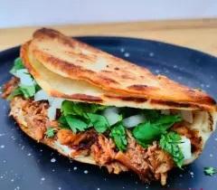 Deliciosa Quesabirria dorada con doble tortilla de maíz, por dentro queso y birria de res.