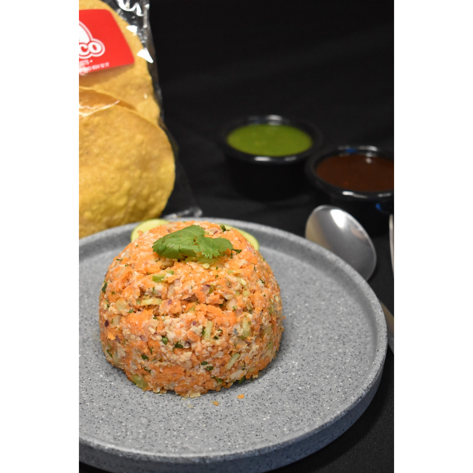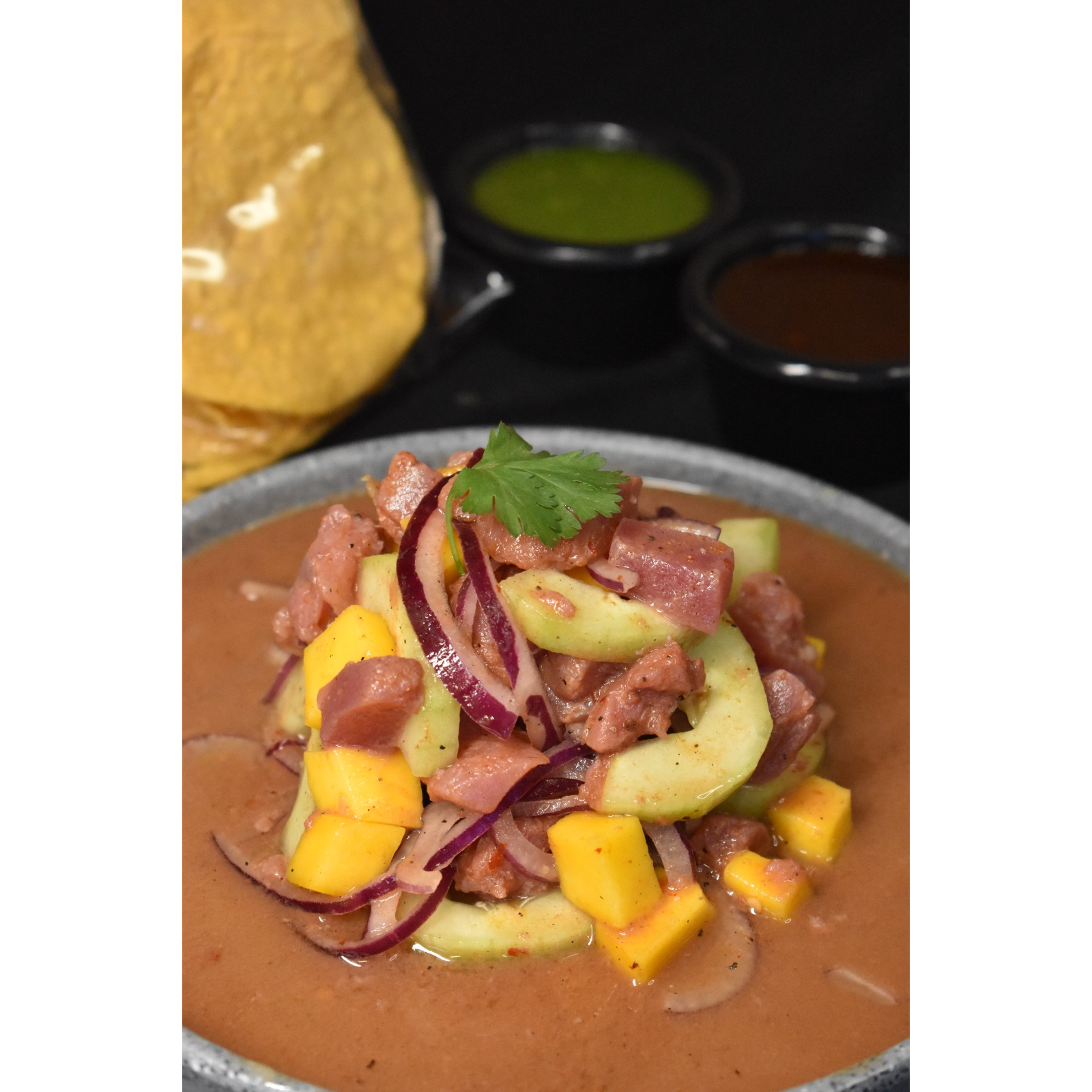Deliciosa tostada tropical de atún, salsa especial de la casa, mango, pepino y cebolla morada en tiras.