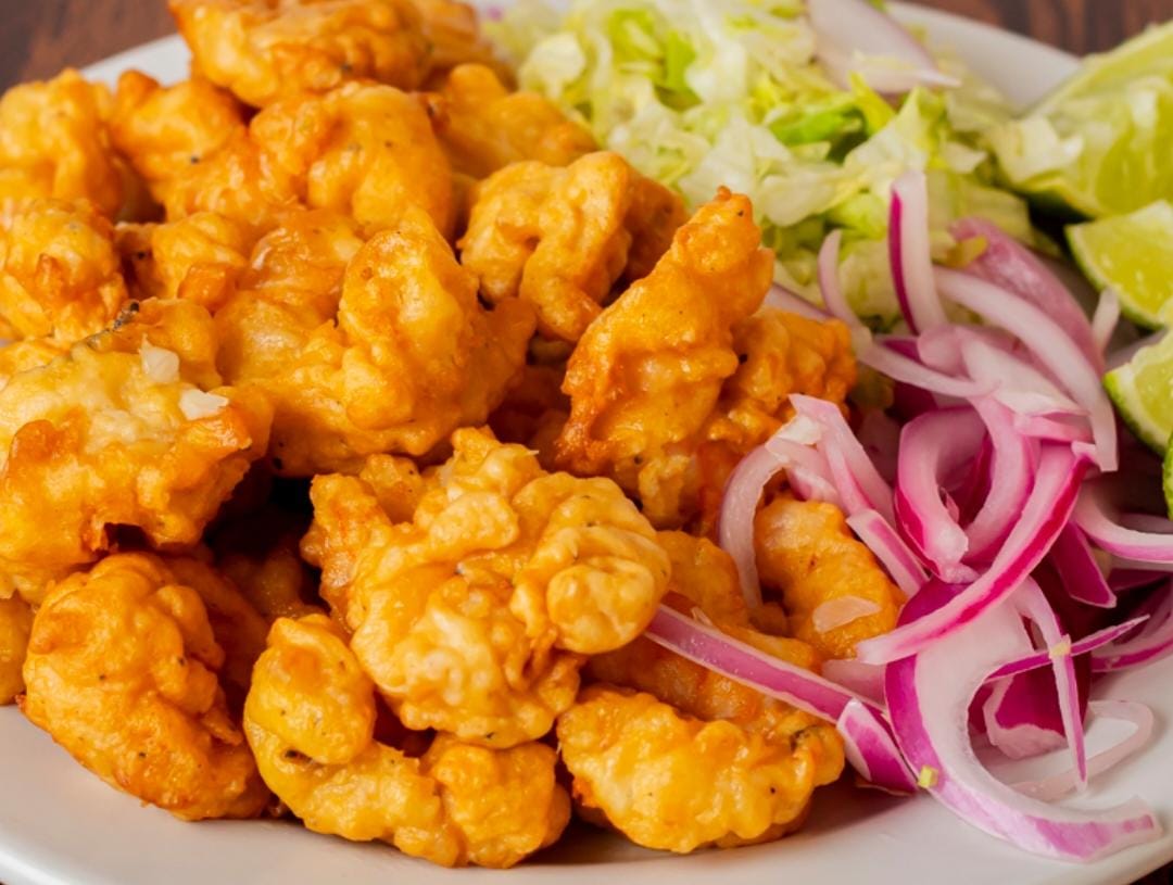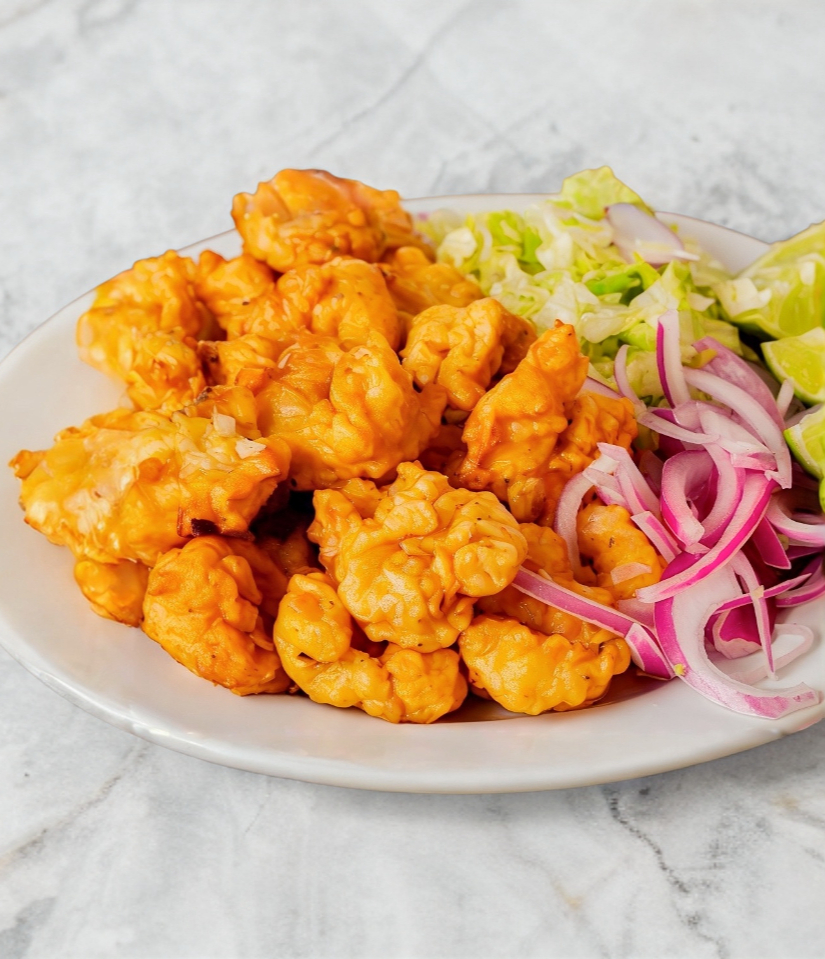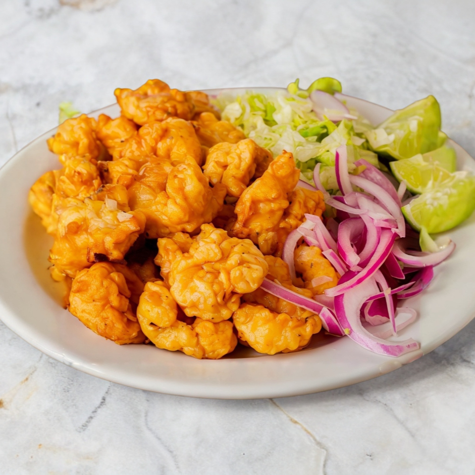 Media orden de camarón capeado servido a granel, lechuga, limones y cebolla aparte, acompañado de tortillas de maíz 100 g.