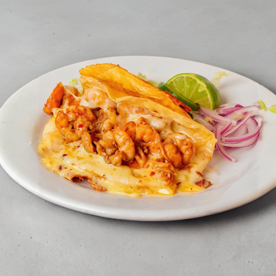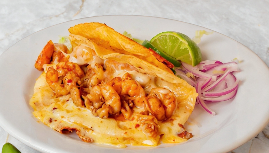 Quesadilla de harina a la plancha dorada con guiso de camarón.