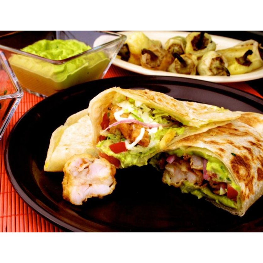 Quesadilla de camarón capeado con tortilla de harina tamaño normal, cebolla, limones y lechuga aparte a elección.