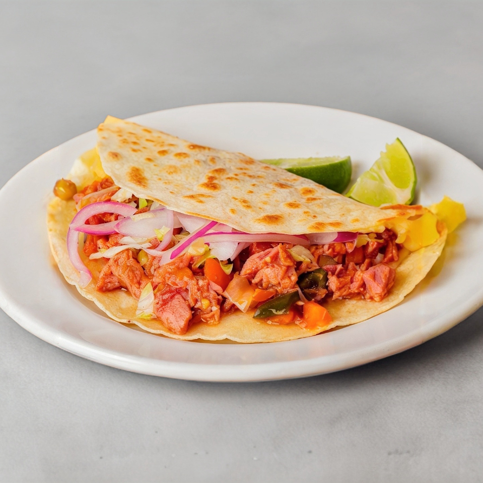 Quesadilla de estofado de marlín, cebolla, limones y lechuga aparte.