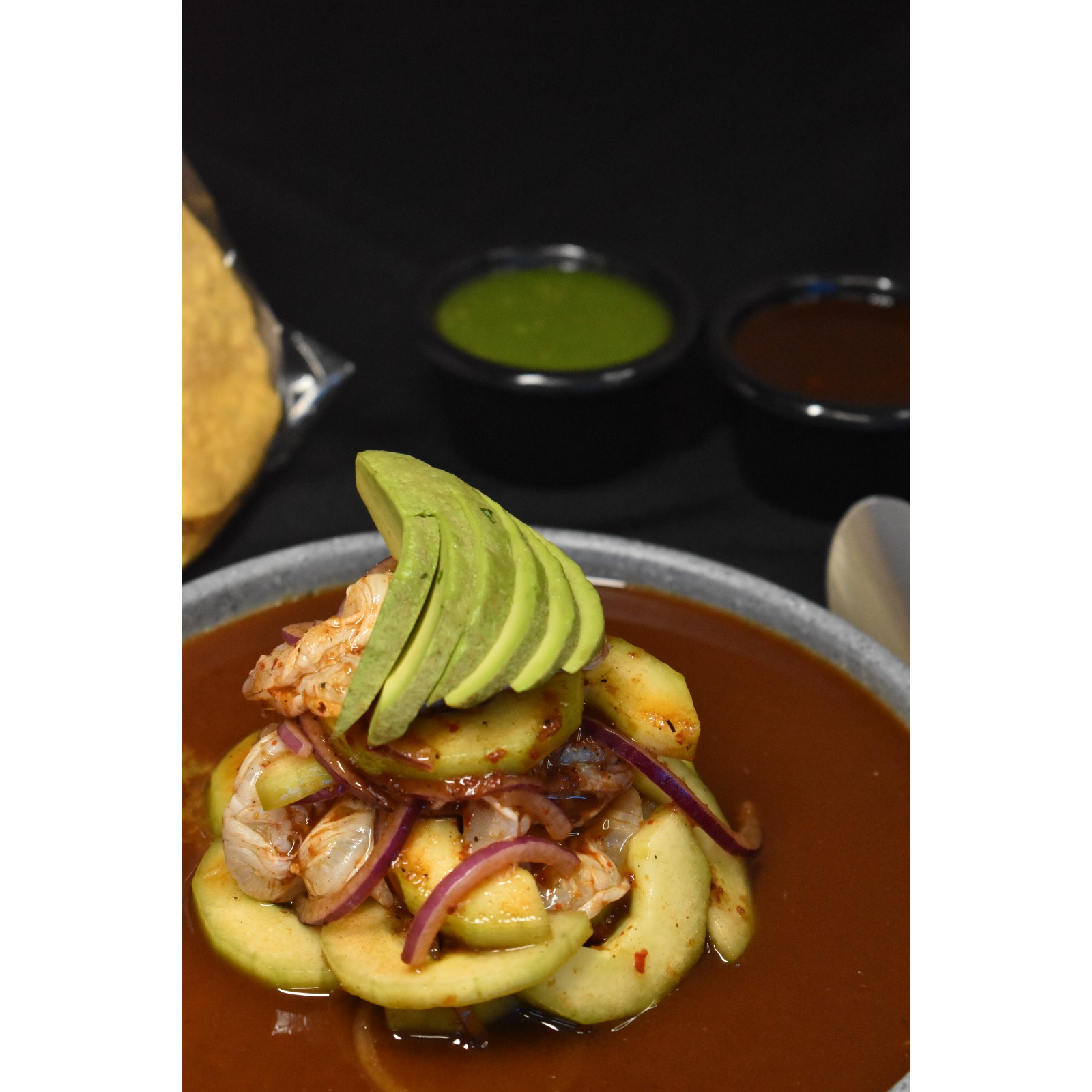 Deliciosa tostada de aguachile en salsa negra, camarón crudo, pepino, cebolla morada en tiras, coronado con rodajas de aguacate.