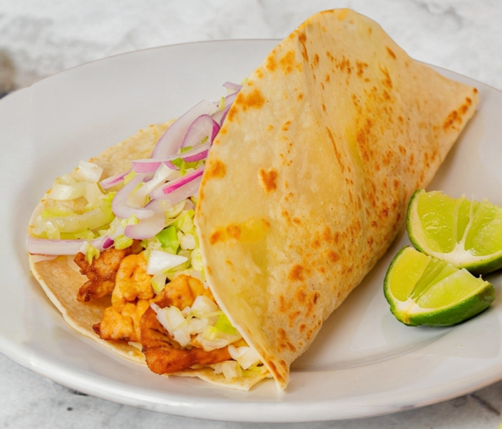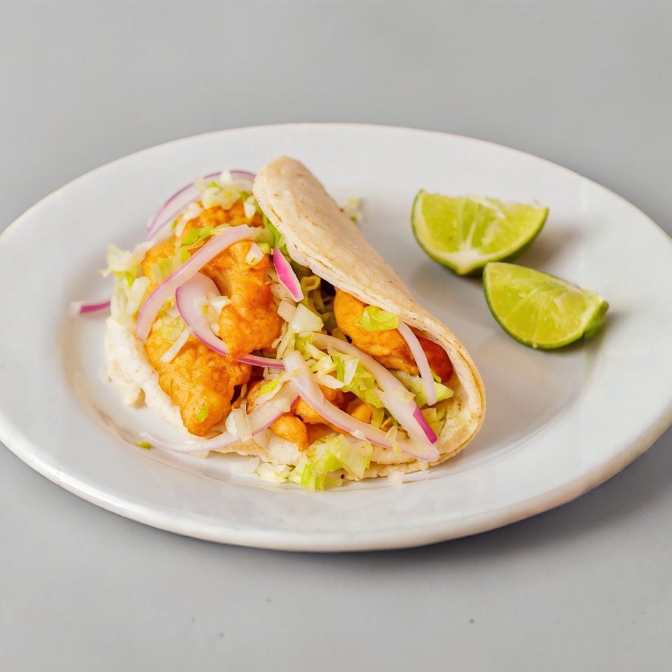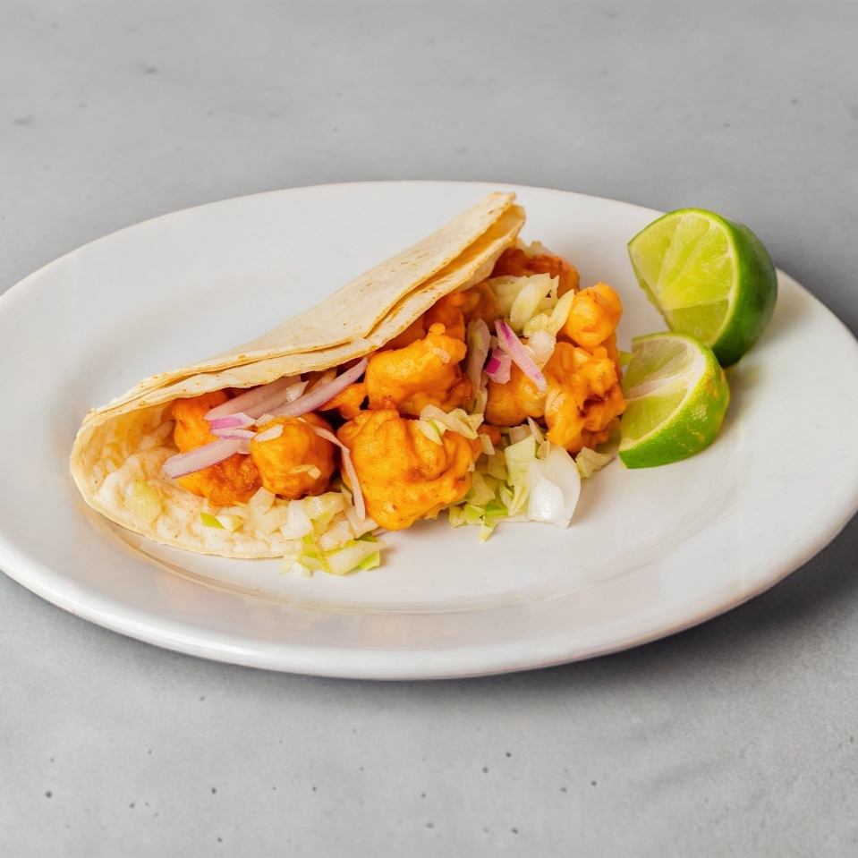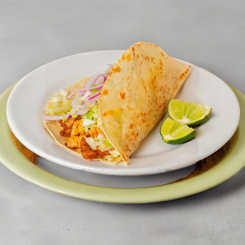 Taco en tortilla de maíz con camarón capeado, cebolla, limones y lechuga aparte.