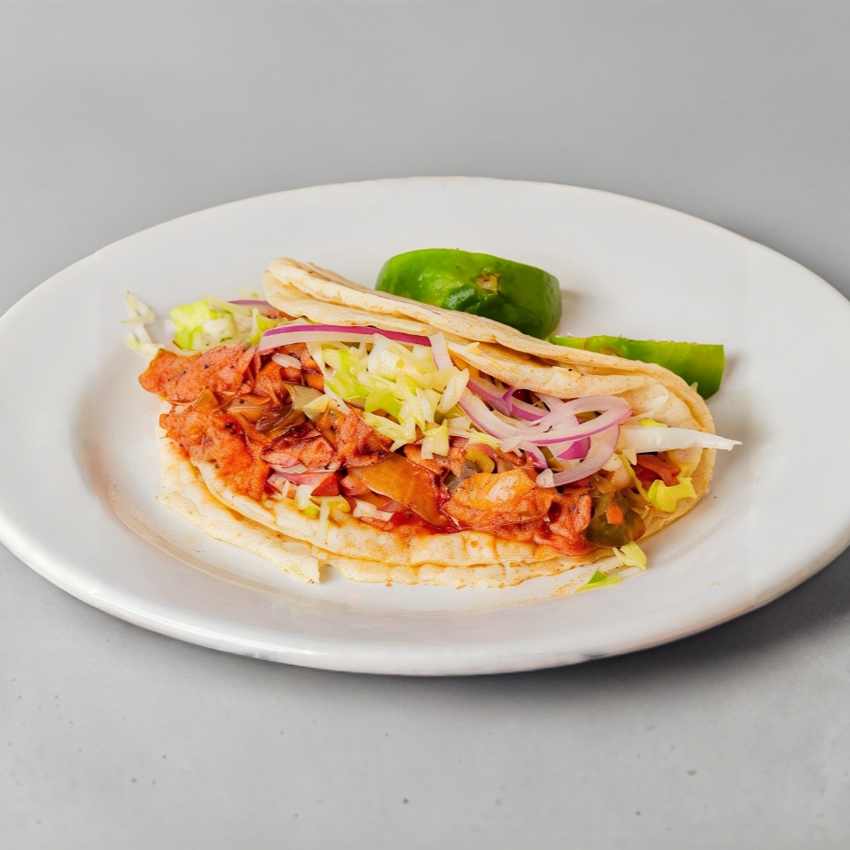 Taco en tortilla de maíz a la plancha dorada con guiso de camarón enchilado, cebolla, limones y lechuga aparte.