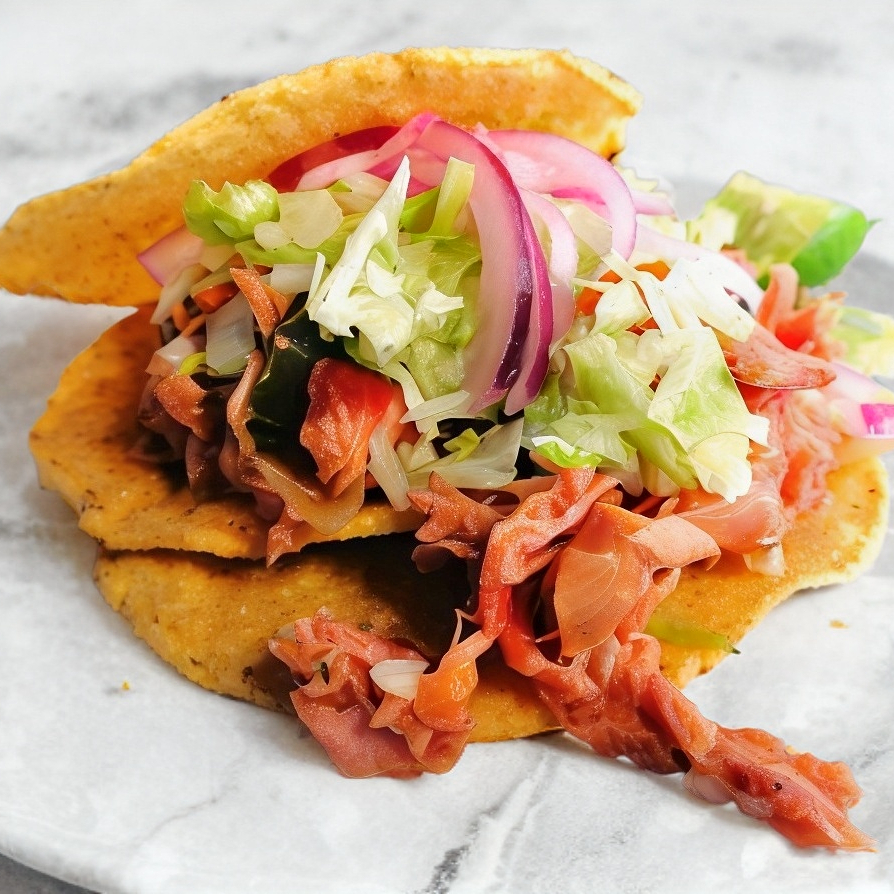 Taco en tortilla de maíz con estofado de marlín, cebolla, limones y lechuga aparte.