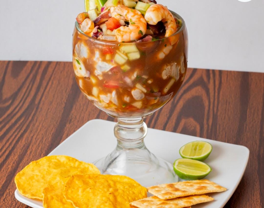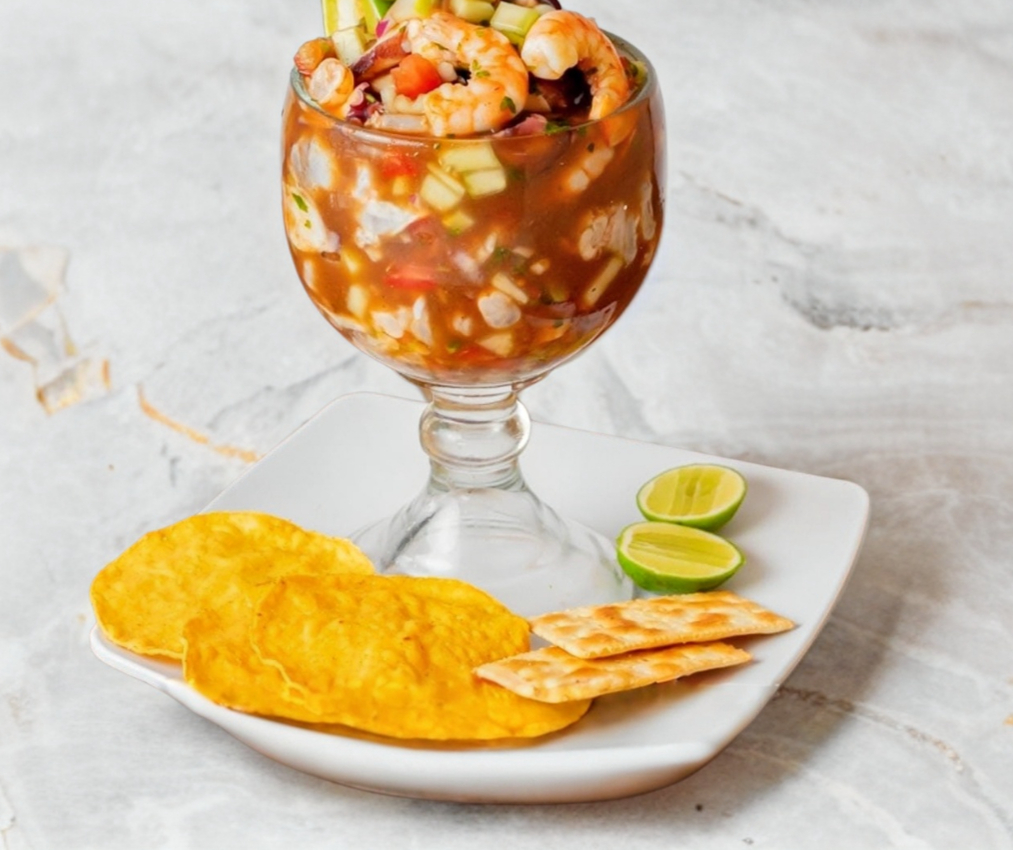 Coctel de camarón cocido con ceviche de camarón y camarón de aguachile.