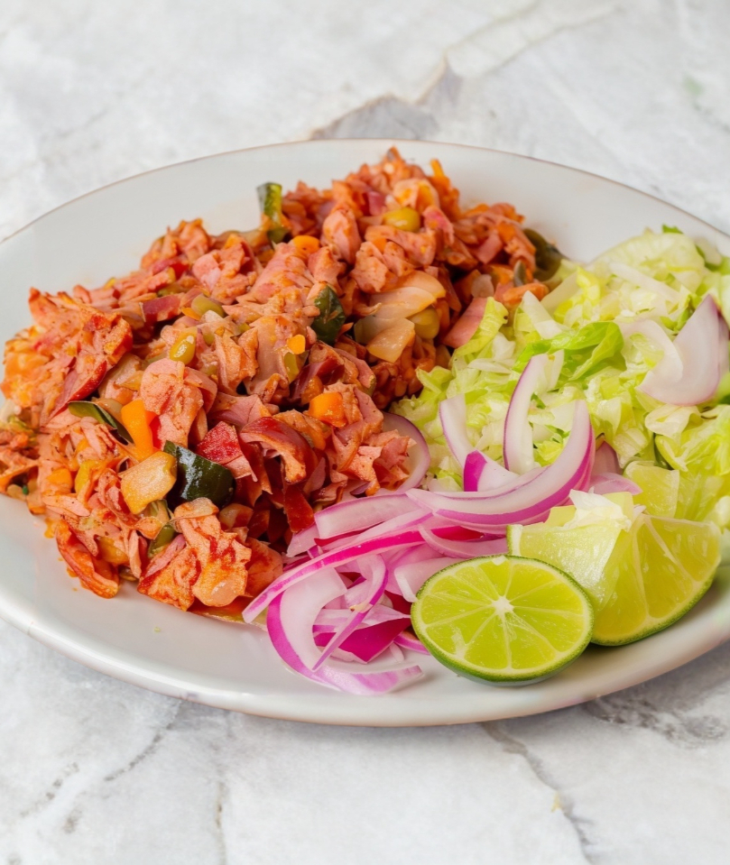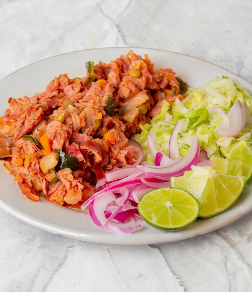 Orden grande estofado de marlín servido a granel con lechuga, limones y cebolla aparte, acompañado con tortillas de maíz 100 g.
