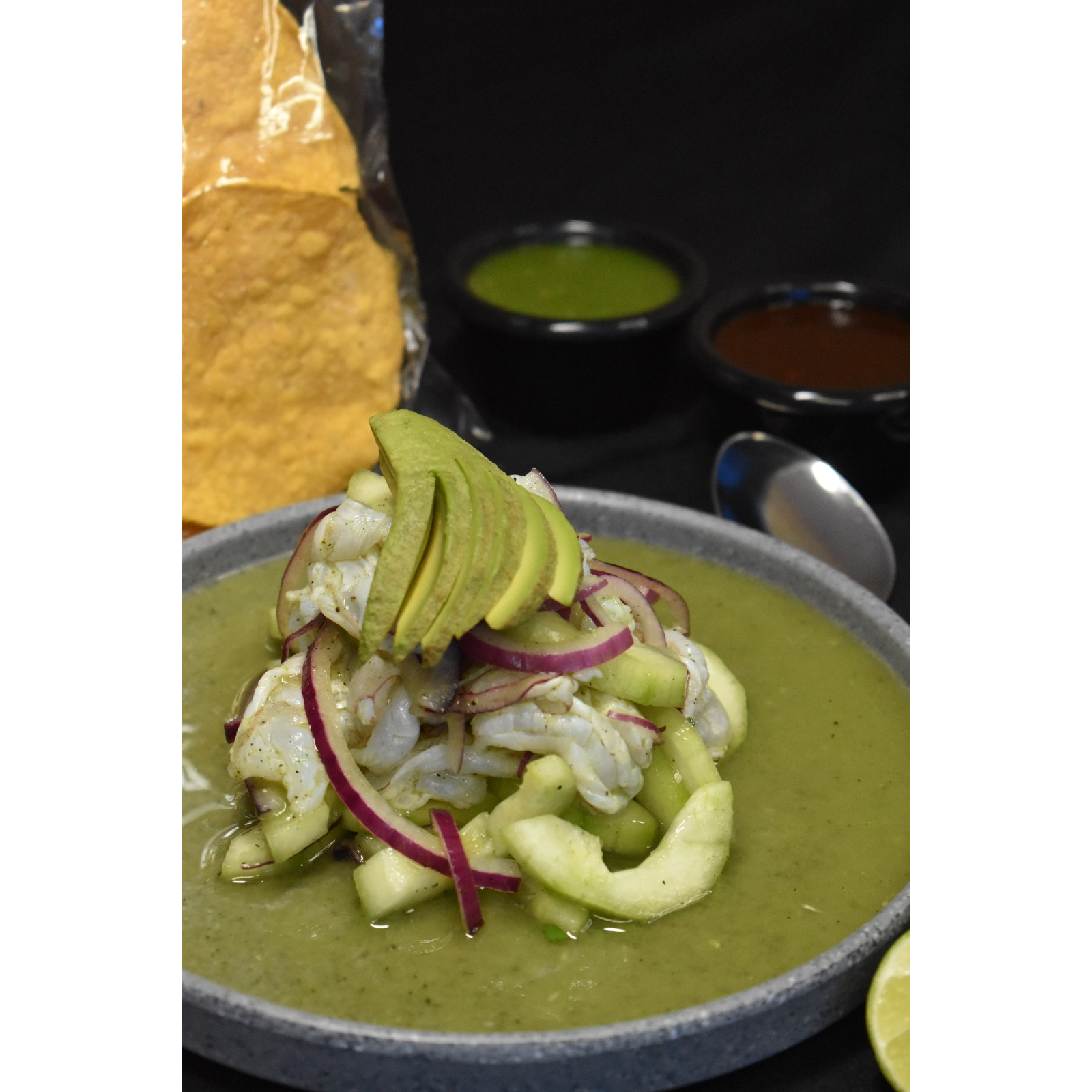 Media orden de ceviche de camarón, acompañado de tostadas y salsas negras de la casa.